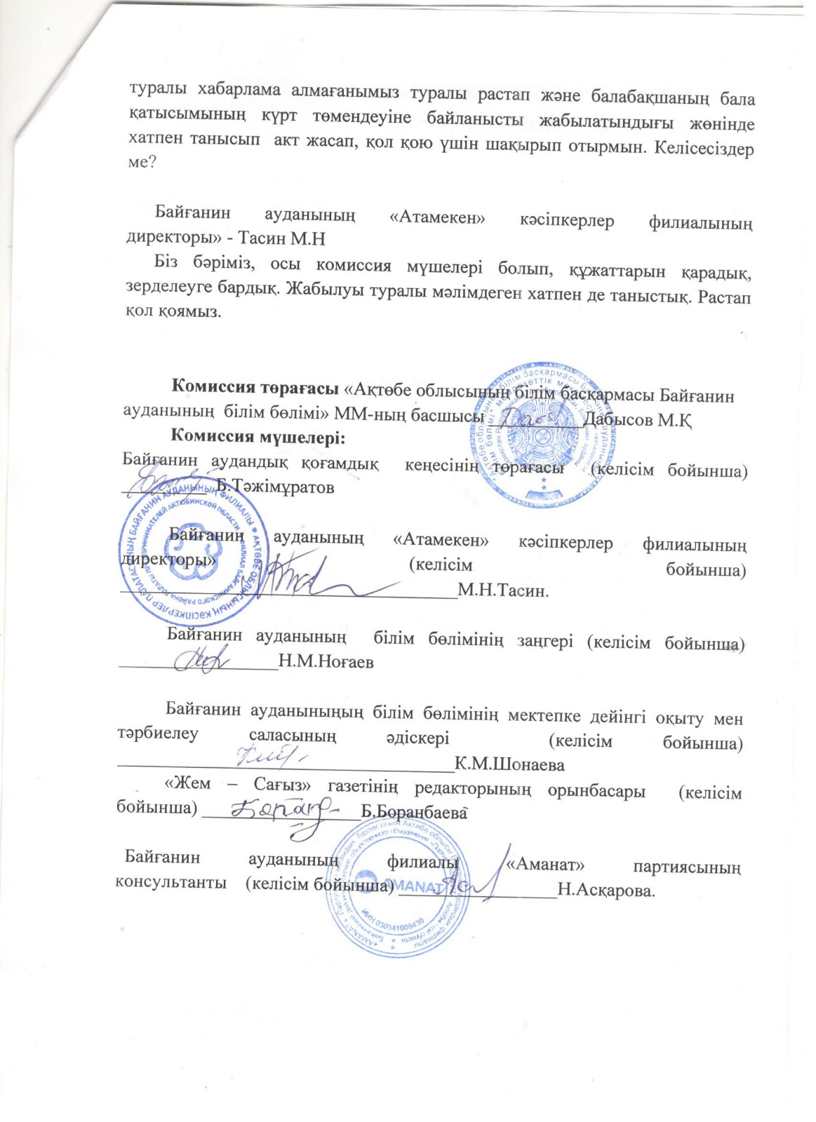 Комиссия төрағасы : М.Дабысов -Білім бөлімінің басшысы