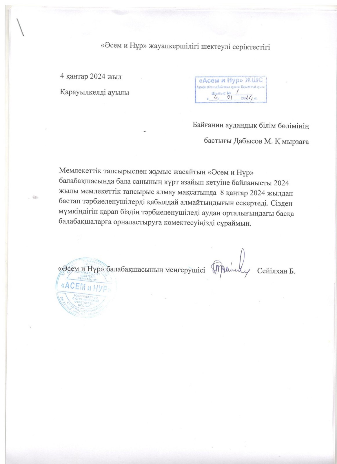 Құжаттарды электрондық форматта ұсыну мүмкіндігі болмаған жағдайда көрсетілген құжаттарды мекттепке дейінгі ұйым ҚР, Ақтөбе облысы Байғанин ауданы Қарауылкелді ауылы Қонаев көшесі, 37. №1 кабинет мекен-жайына қағаз форматта жібереді.