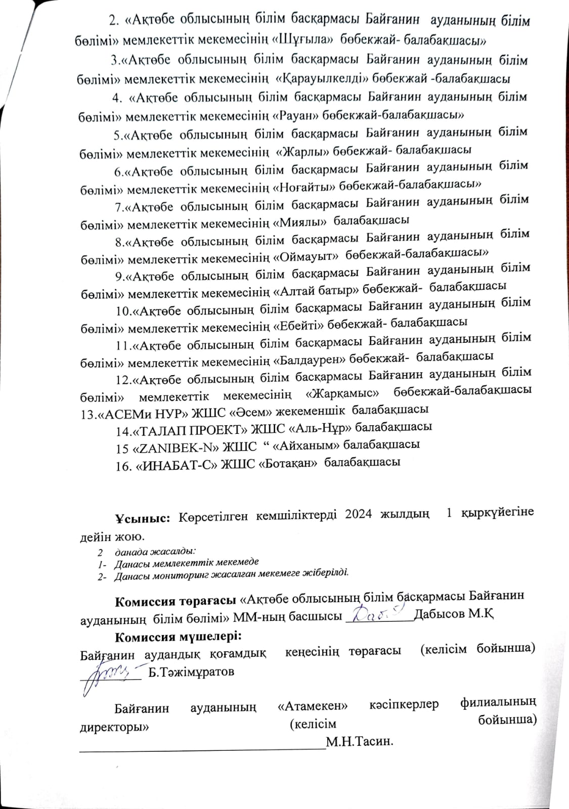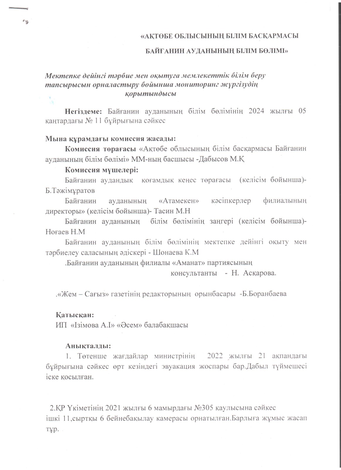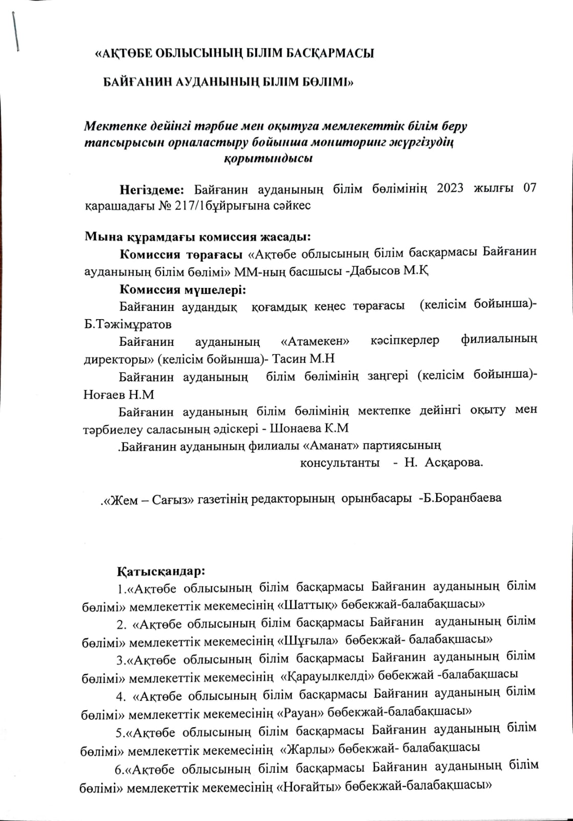 - Байғанин ауданының білім бөлімінің басшысы М.Дабысовтың төрағалық етуімен мемлекеттік тапсырыс алу үшін құжат тапсырған мектепке дейінгі ұйымдардың құжаттары тағы бір мәрте қаралды. Мониторинг қорытындысы туралы акт жасалды.
