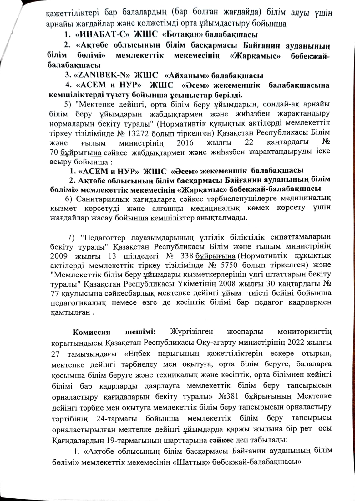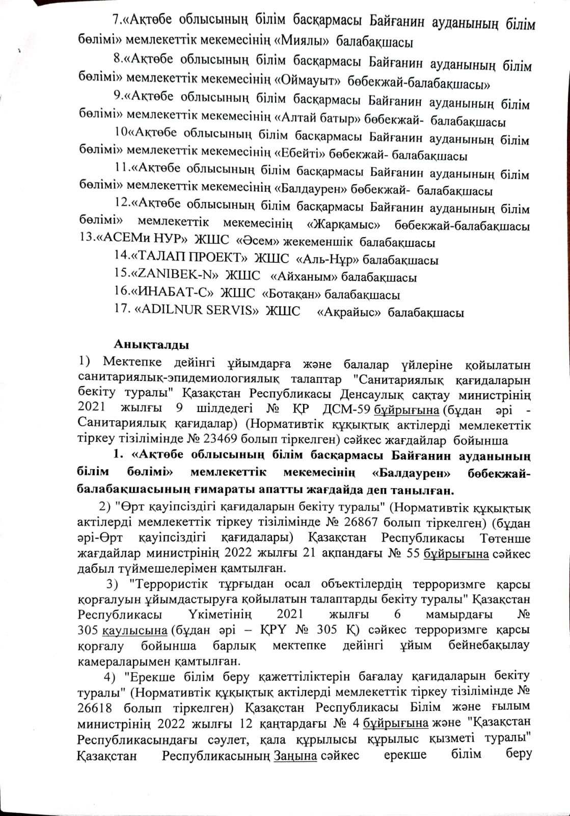 Қ.Р Оқу- ағарту министрінің 2022 жылғы 27 тамыздағы «Еңбек нарығын ескере отырып,мектепке дейінгі тәрбиелеу мен оқытуға .орта білім беруге,балаларға қосымша білім беруге, және техникалық және кәсіптік, орта білімнен кейінгі білімі бар кадрларды даярлауға мемлекеттік білім беру тапсырысын орналастыру қағидаларын бекіту туралы» №381 ші бұйрығына сәйкес мектепке дейінгі ұйымның мемлекеттік білім беру тапсырысын орналастыру және тізбесін жариялау туралыбұйрығына сәйкес мемлекеттік білім беру тапсырысын орналастыру және мектепке дейінгі тәрбиеге мемлекеттік білім беру тапсырысын алу үшін төмендегі мектепке дейінгі ұйымдар 2024 жылға мемлекеттік білім беру тапсырысын алуға жіберілді.