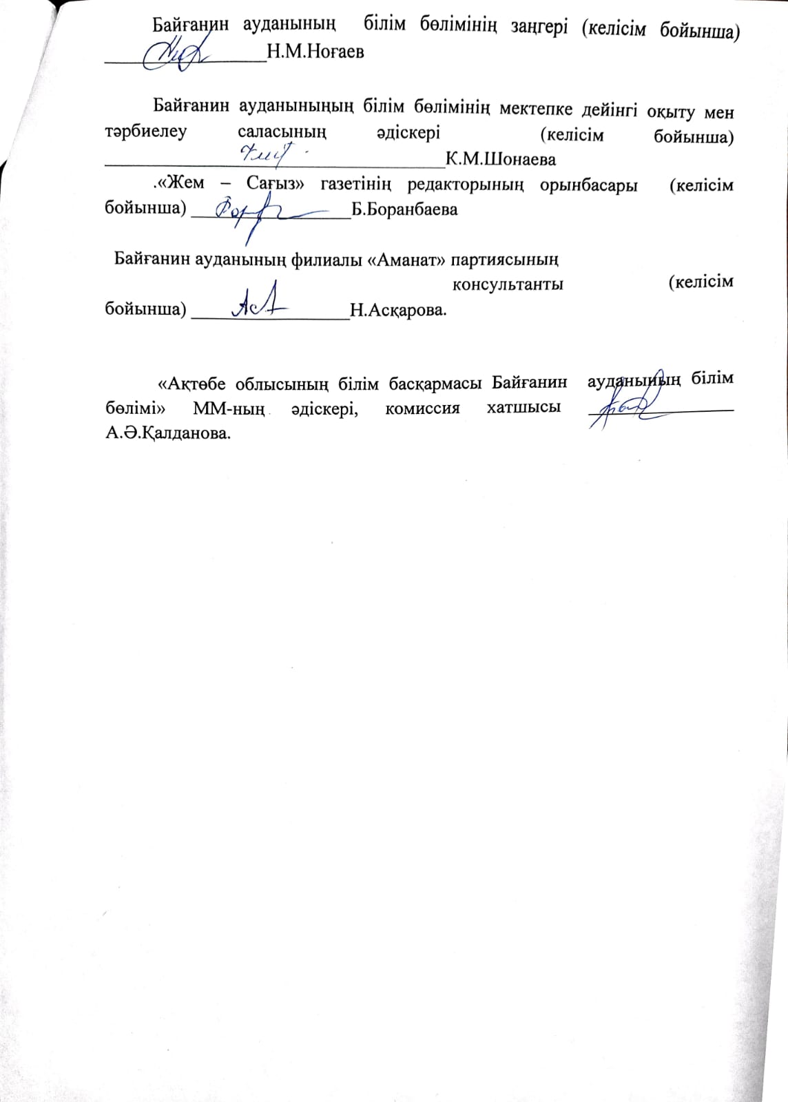 - төрағасы: Байғанин ауданының білім бөлімінің басшысы М.Дабысов
