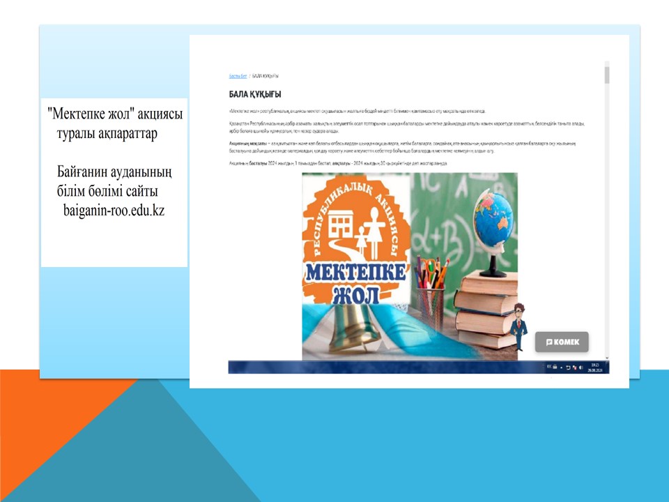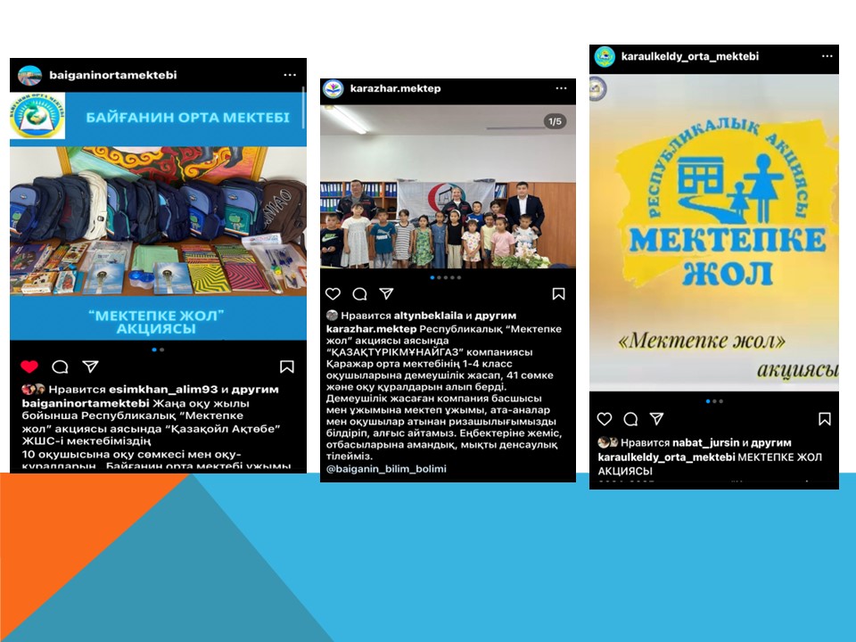 Байғанин ауданының білім бөлімі «Мектепке жол » акциясын өткізу бойынша барлық білім беру мекемелеріне әдістемелік ұсынымдарына сәйкес бұйрық шығарылып, іс-шара жоспарына сәйкес жұмыстар атқарылып жатыр. «Мектепке жол» акциясы барысының өткізілуі туралы жергілікті «Жем-Сағыз» газетіне және https://baiganin-roo.edu.kz/kz/ сайтына және baiganin_bilim_bolimi инста желісіне хабарлама жіберіліп, интернет желілеріне таратылды.