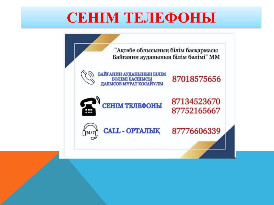Байланысу мекенжайы: Байғанин аудандық білім бөлімі. Тел:871345-23670. «CALL- ОРТАЛЫҚ» тел: +7 702406 96 16