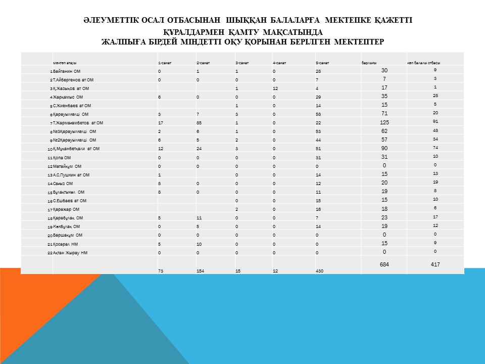 Т.Жармағамбетов атындағы орта мектебінің 1класқа баратын төмендгідей аталған оқушыларға демеушілікпен мектепке қажетті оқу-құралдары мен мектеп сумкасымен қамтылды. Балалар мұқтаждық етпейді.